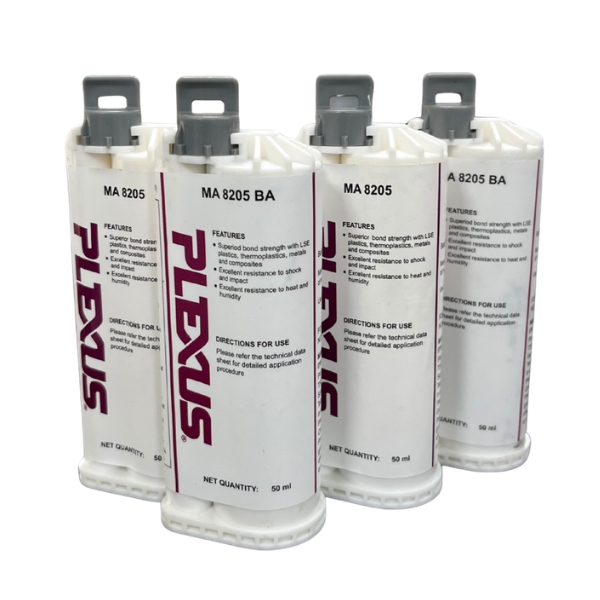 Plexus® MA8205/BA is a two-part methacrylate adhesive designed for structural bonding of low energy plastics like polypropylene, high density polyethylene (HDPE), nylon along with thermoplastics, metals and composites. Combined at a 10:1 ratio by volume, MA8205/BA has a working time of 3-5 minutes and achieves 75% of ultimate strength in 60 minutes at 25°C. This two-component structural adhesive cures at room temperature and the mixed formulation develops tough, strong, structural bonds which provides excellent resistance to shock and impact with excellent resistance to heat and humidity. MA8205/BA is available in a ready-to-use 50ml cartridge in both white ( MA8205) and black color (MA8205BA) options.